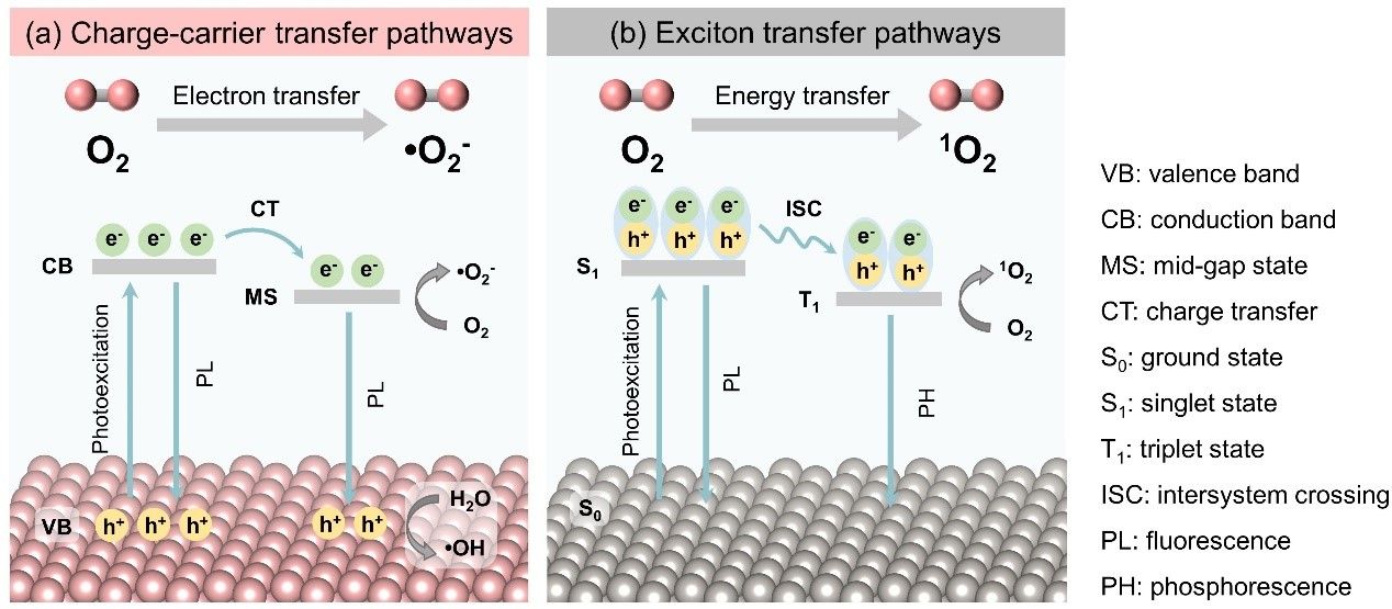 This study presents an innovative modification strategy that simultaneously regulates excitonic effects and photogenerated charge carrier recombination processes, significantly enhancing the pathway selectivity for oxygen activation in 2D materials. Using graphitic carbon nitride (CN) as the model, the researchers prepared a modified material (CN-Cy-Na) by introducing cyano groups and sodium ions via a molten salt treatment.This study finds that the cyano groups increase the local charge density of CN, promoting exciton dissociation by attracting holes. The dissociated holes are captured by cyano groups, while electrons undergo rapid migration under the synergistic enhancement of an internal electric field created by cyano groups and Na ions. Sodium ions substantially enhance the electron-trapping effect of CN, creating localized potential wells to capture rapidly migrating electrons for subsequent O₂ activation reactions. Sodium ions also facilitate O₂ adsorption and improve charge transfer between the catalyst and O₂.