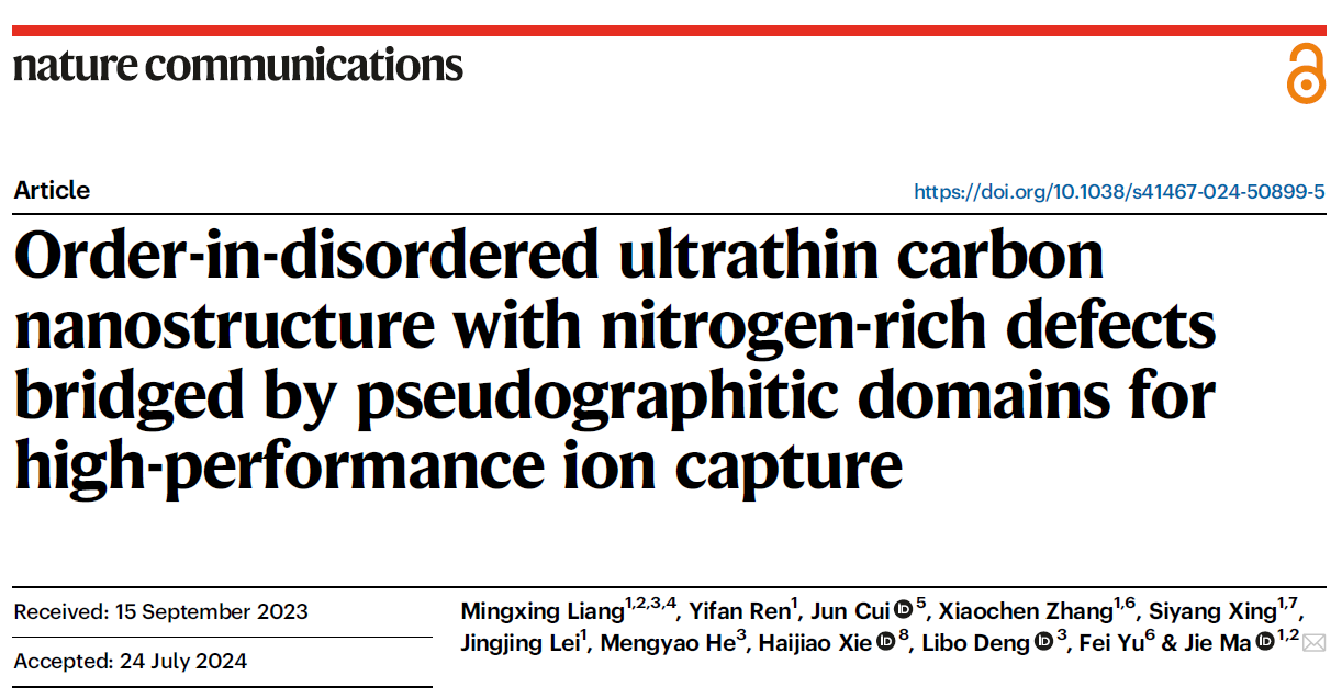 Prof. Jie Ma and his cooperators have published a research paper in the international authoritative journal 《Nature Communications》: Order-in-disordered ultrathin carbon nanostructure with nitrogen-rich defects bridged by pseudographitic domains for high-performance ion capture, Nature Communications, 2024, 15, 6437.