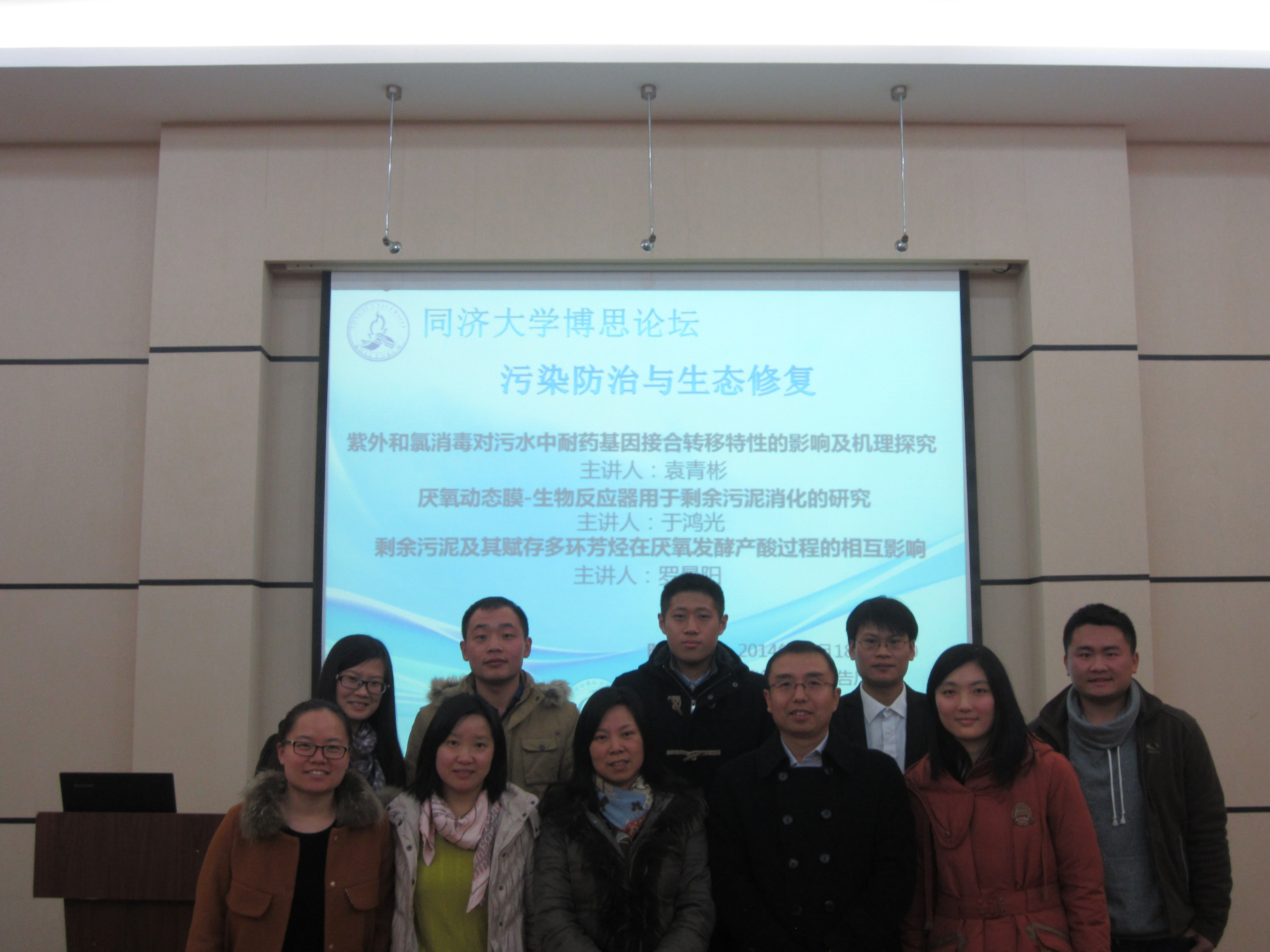 2014年12月18日下午,williamhill官网“博思论坛”环境学院分论坛在威廉希尔足球网明净楼4楼报告厅成功举办。本次分论坛的主题为“污染防治与生态修复”,邀请到了环境学院的李咏梅教授、王荣昌副教授以及谢丽副教授作为点评嘉宾,11级博士袁青彬、于鸿光以及13级博士罗景阳作为汇报人,分别就“紫外和氯消毒对污水中耐药基因接合转移性的影响及机理研究”、“厌氧动态膜-生物反应器用于剩余污泥消化的研究”和“剩余污泥及其赋存多环芳烃在厌氧发酵产酸过程中的相互影响”等内容做了精彩分享。