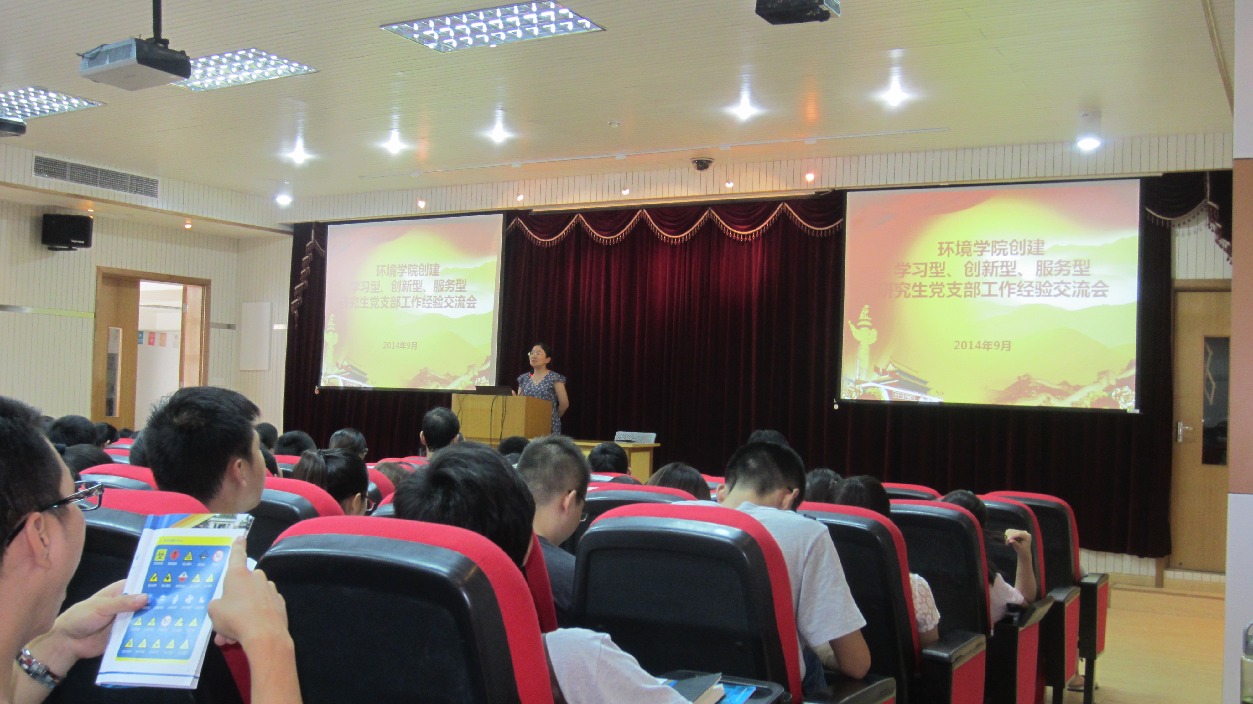 2014年9月11日下午1点半,环境学院学生党总支开展2014级新入学研究生党员培训,主要内容是介绍“创建学习型、创新型、服务型研究生党支部”支部创建要求、创建情况、心得体会,以及面向新入学党员开展第一次党课《读书立德》。参加此次经验交流会的有williamhill官网组织部特聘组织员、原体育部党委书记杨梅芳老师,学院党委副书记钱昕老师,学工办贺贝贝老师,2012级和2013级各班级党支部支部书记以及全体2014级研究生新生党员。