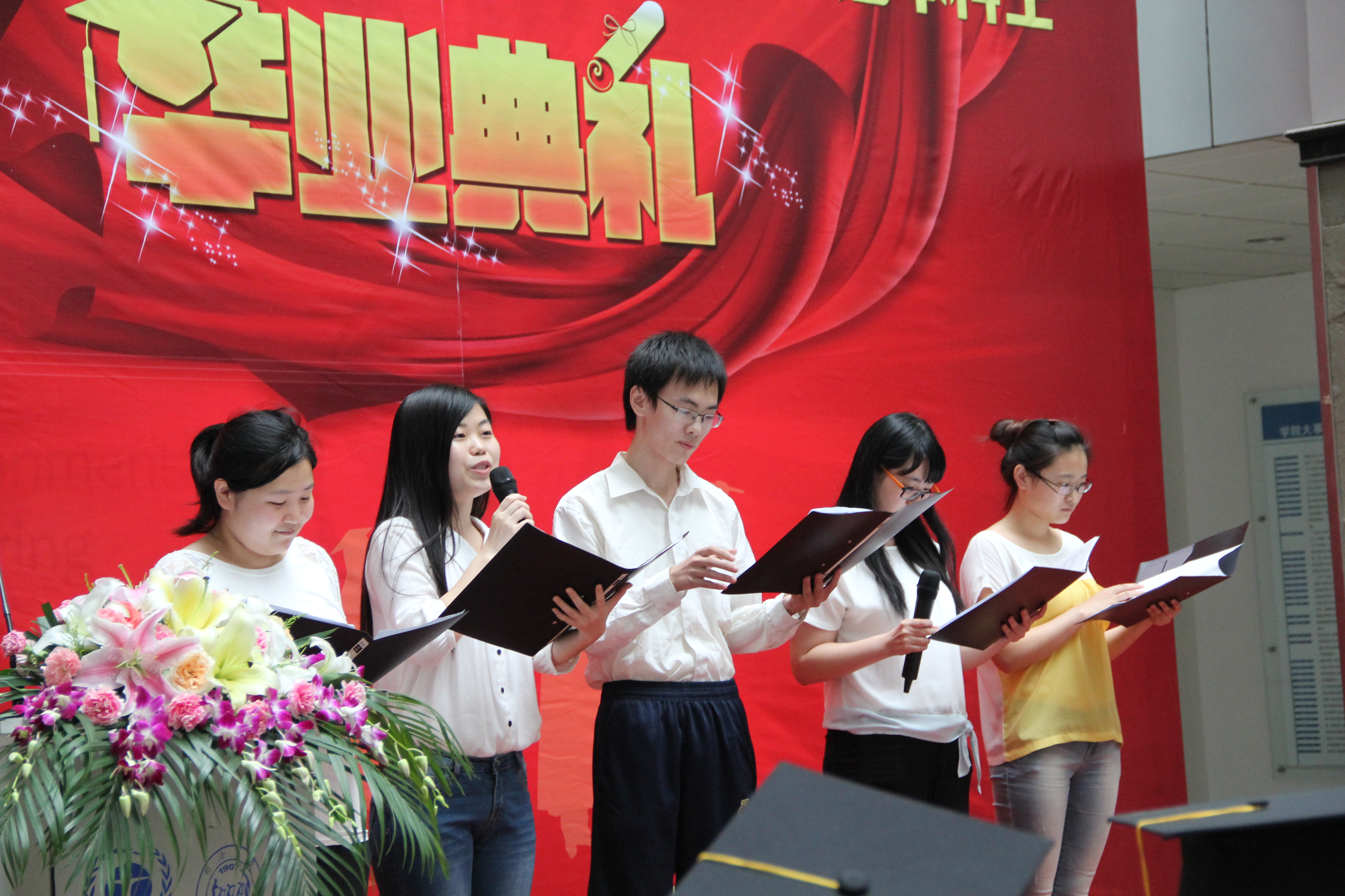 2014届毕业生们也举办了精彩的毕业季活动,包括以“纪年”为主题的毕业照拍摄、赠与学弟学妹的成果集制作以及班级照片展示活动,以“继梦”为主题的跳蚤市场活动,和以“济青春”为主题的毕业晚会等。为表达自己对母校和学院的感恩之情,2014届毕业生代表上台向黄翔峰书记和尹大强副院长赠送了离校纪念物——两套组合活动桌椅,它们将被摆放在学院一楼大厅供同学们使用。毕业生们也精心为学弟学妹们准备了一份特别的礼物,承载着他们奋斗与努力的经验集,非毕业班的学生为毕业生们表演了诗朗诵《送别》作为答谢并以此祝福,明年或许他们也会站在这里与母校、学院告别,一代代环境人迎来送往,传承的是不变的精神,留下的是永恒的回忆。