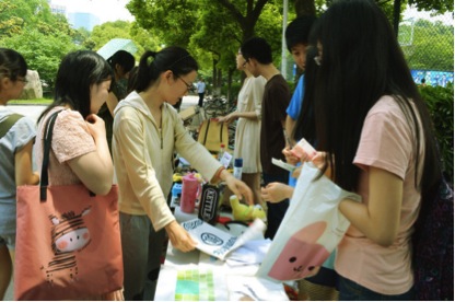 除了向毕业生收集的二手用品外,跳蚤市场里极具特色的一件商品便是毕业生同学们自已创作的手绘环保袋。简单实用的环保袋倡导了绿色校园的理念,环保与可持续发展深入校园,这便是一代代同济环境学子不断传承与创新的坚定信念。活动现场还为同学们提供了自行创作的材料和工具,乳白色的环保袋在心灵手巧的同学们手中变成了一件件独具风格的艺术品,无疑成为所有摊位最热销的商品。