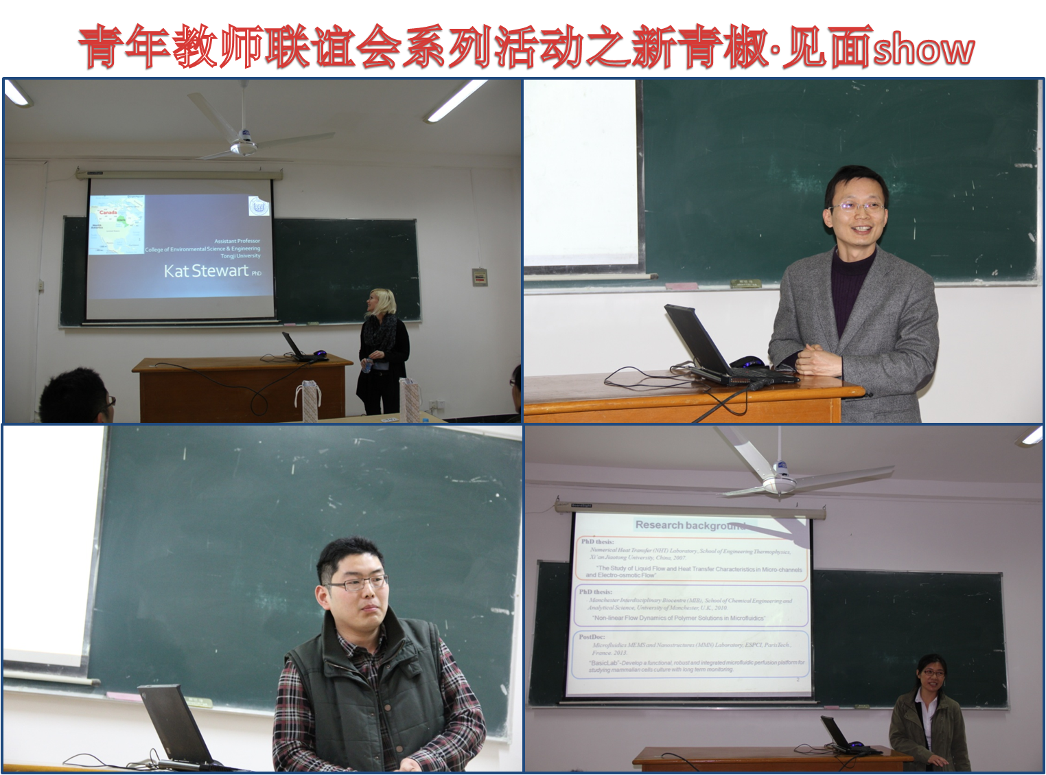为促进青年教师之间进行工作、学习、生活上的交流,我院青年教师联谊会于4月22日下午一点半在明净楼109教室,举办了环境学院第一期“新青椒·见面show”活动。活动邀请了4位新进的优秀青年教师,分享了他们的学术经历、研究方向、经验分享以及到学院工作后的感受等。我院来自“三系一所”、重点实验室、实验教学中心和工程中心的30余位老师参加了本次活动,此外本次活动还吸引了正在我院进行访问的瑞典友人的热情参与。
