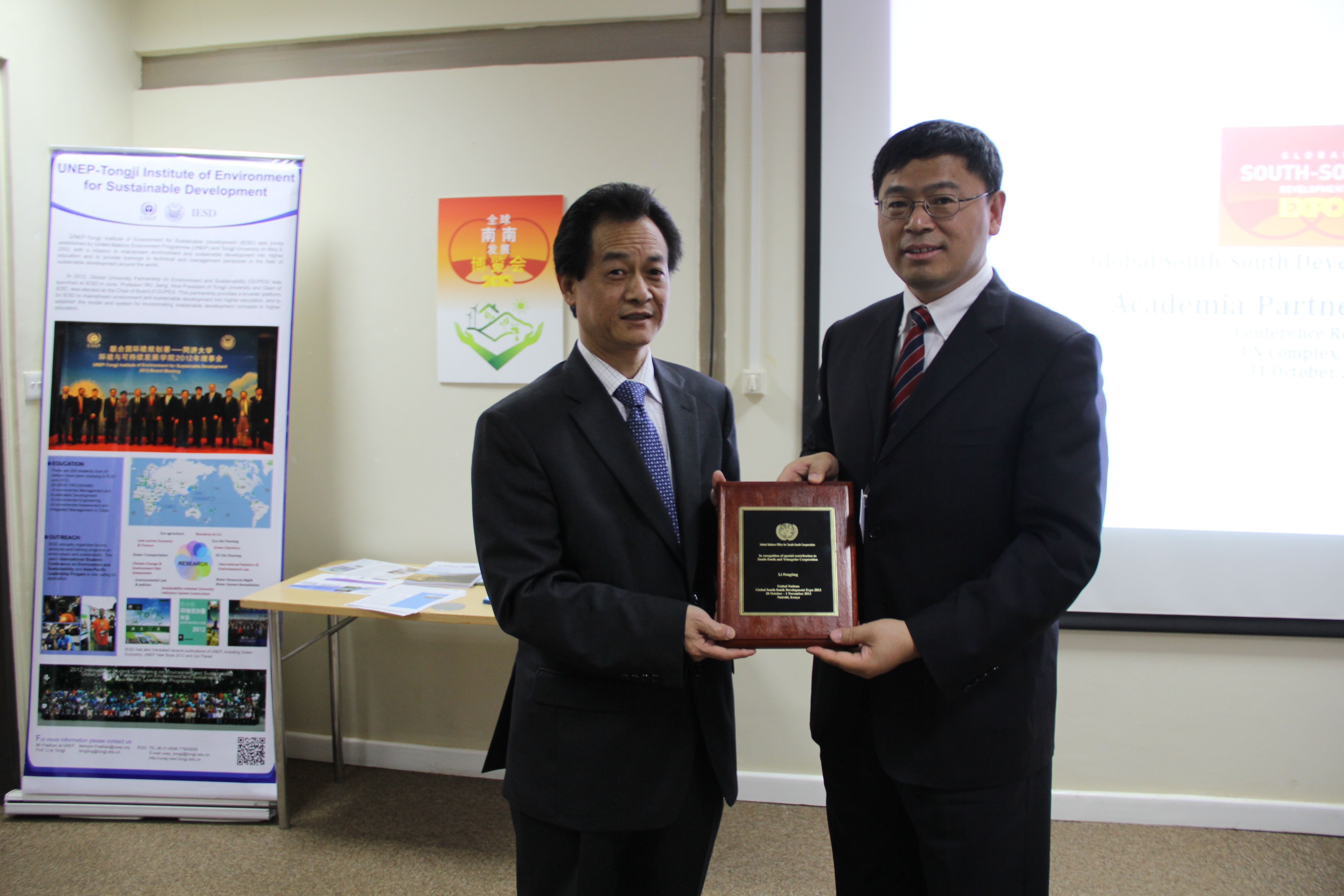 正值2013年全球南南发展博览会期间,从肯尼亚首都内罗毕市联合国环境规划署总部传来了好消息,我院李风亭教授获得了由联合国南南合作局颁发的“南南合作特殊贡献奖”。联合国南南合作局周一平局长亲自为其颁奖,以表彰李风亭教授在过去十余年间以联合国环境规划署--williamhill官网环境与可持续发展学院为平台,在促进南南合作,特别是中非合作方面的突出贡献。