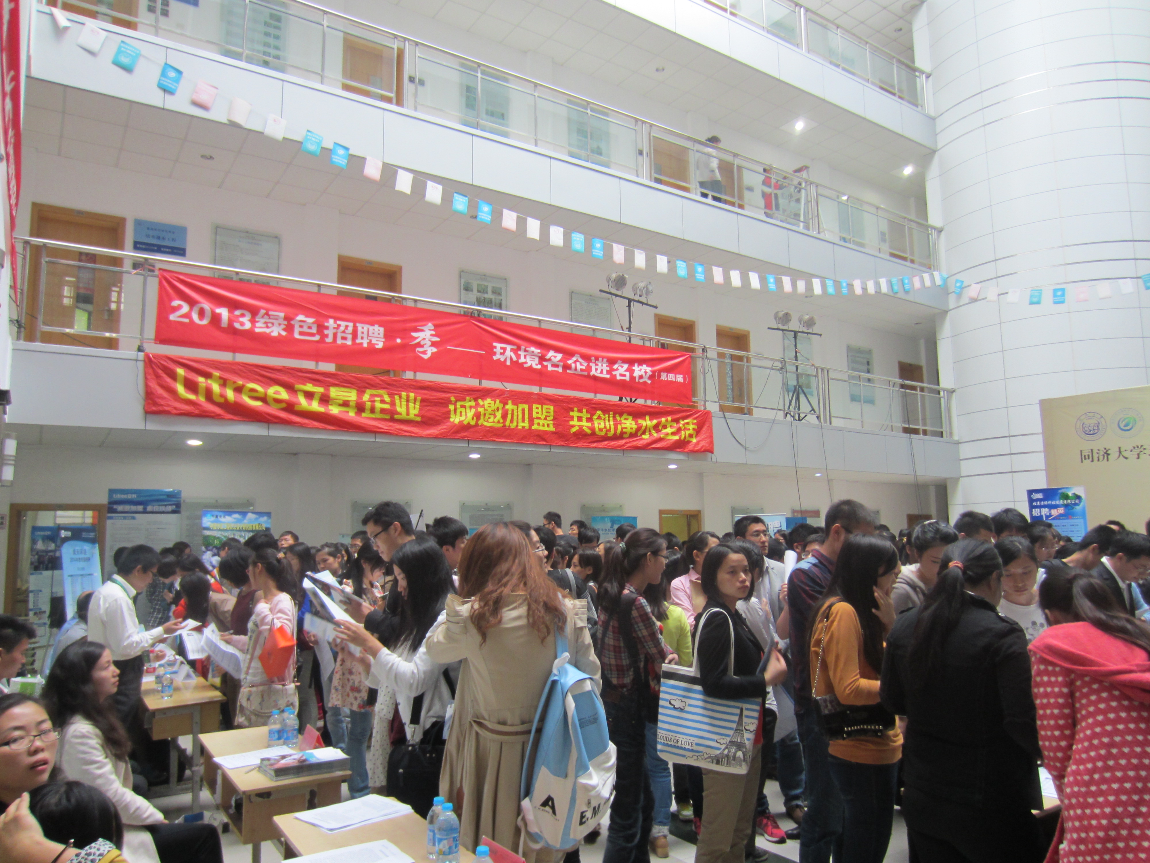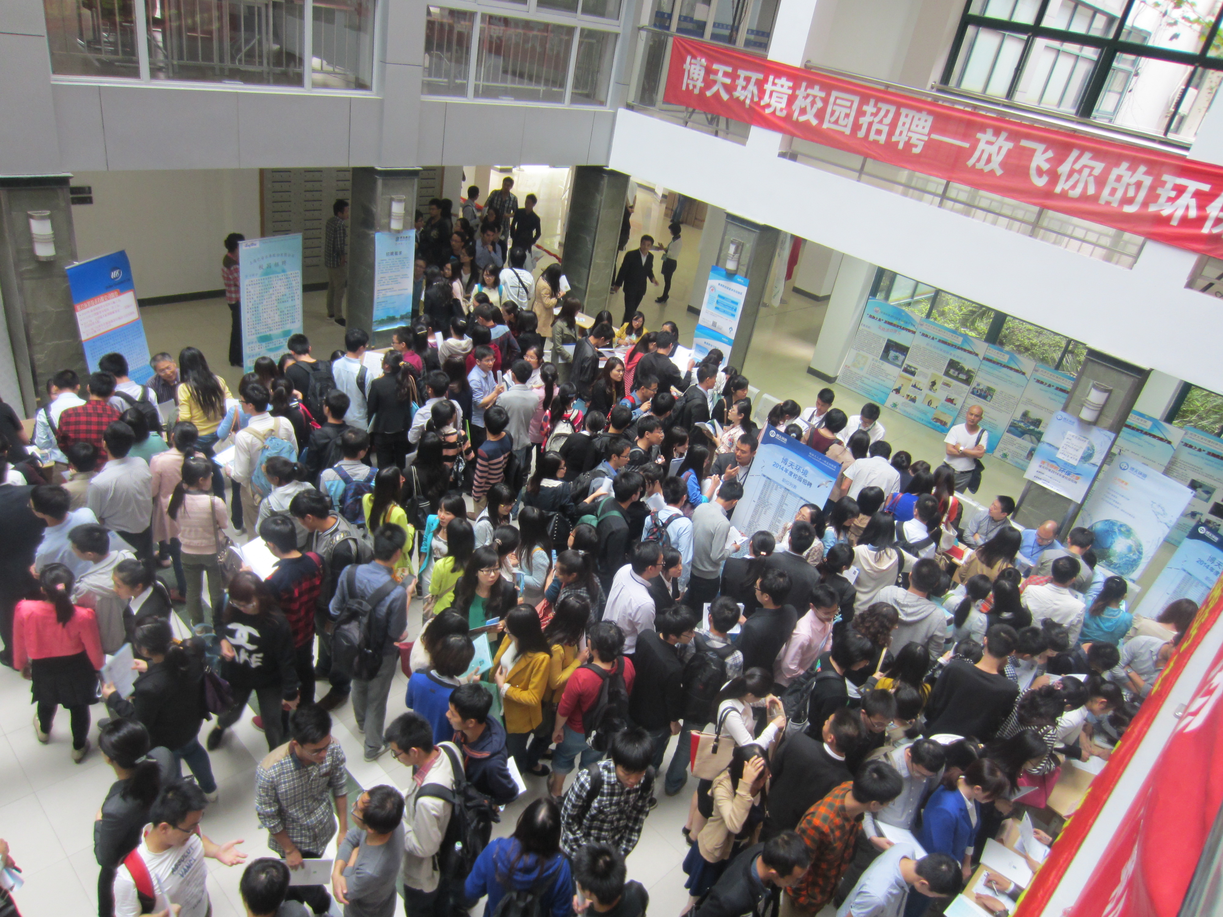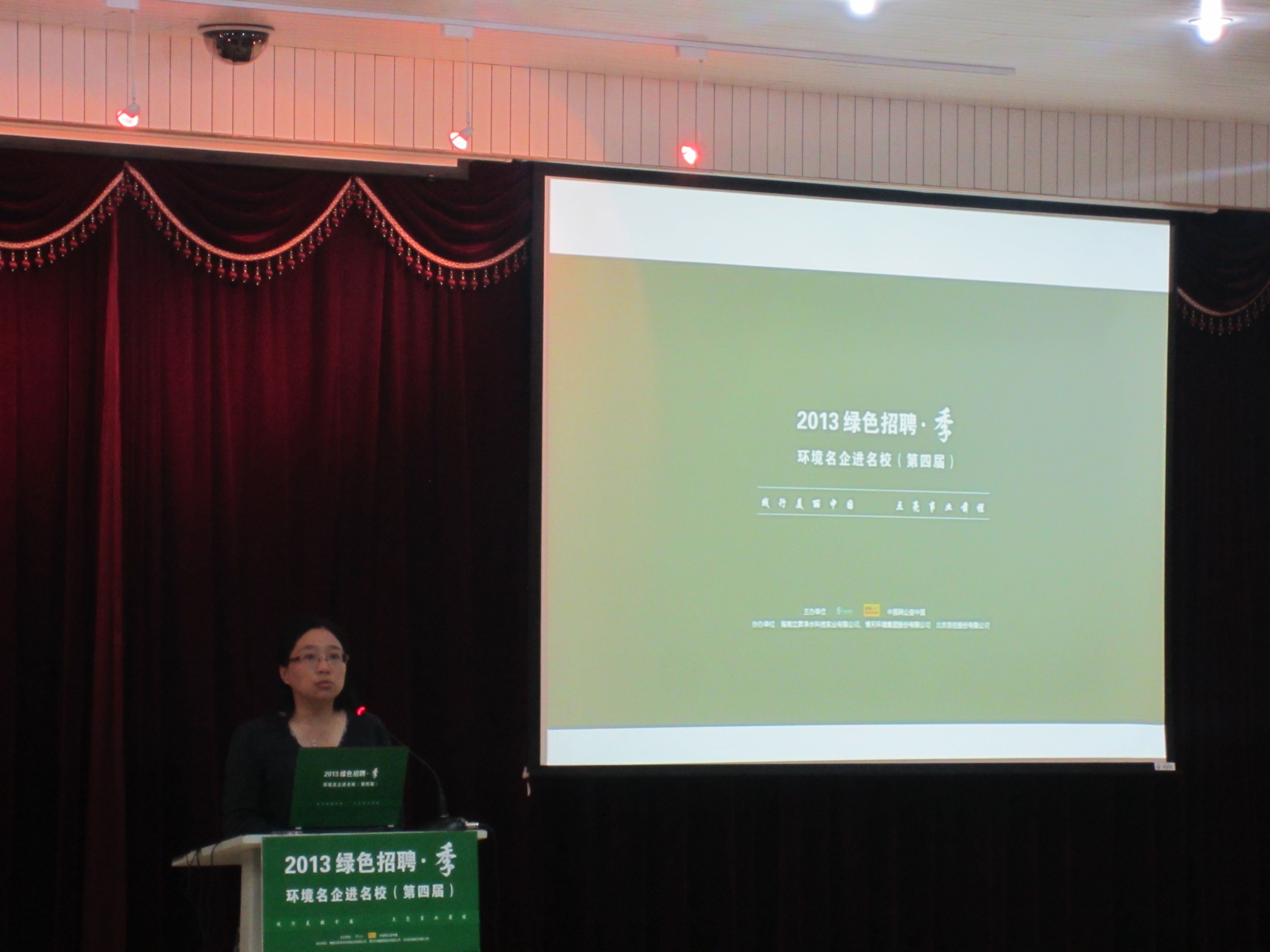 2013年 10月15日,以“践行美丽中国,点亮事业前程”为主题的2013绿色招聘季活动在我院举行。秉持着“环境名企进名校”的理念,本次招聘活动请到了约20家涵盖央企、国企、外企、上市公司、民企的环境领域企业。在上午于明净楼121报告厅举办的宣讲会上,多位与会企业的总经理、人力资源总监亲自出席,向在座的同学们介绍了企业的文化价值、人力资源政策、校园招聘程序及职位介绍等信息,并向现场学生发出诚挚邀请。宣讲会吸引了很多学生前来,同学们或站或坐,气氛热烈而有序。我院党委副书记钱昕老师出席宣讲会并致辞。