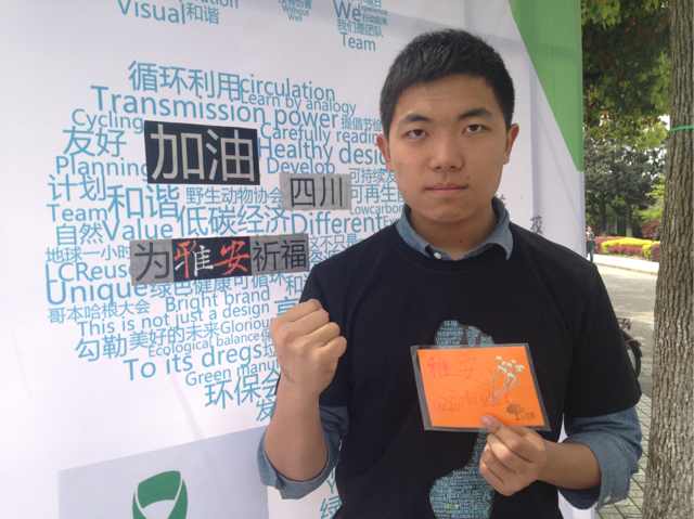 雅安灾情牵动着中国心,凝聚了民族情。4月22日,雅安地震后的第一个工作日,我院紧急决定将环境文化节子活动“环保书签DIY”的所得款项全数捐赠给雅安灾区,为雅安的救灾与重建尽一份力。于四平路校区南大道开展的该义卖活动得到了来往同学的积极响应,同学们纷纷在制作书签的同时,写下他们对千里外受灾人民的祈福寄语,盼望亲人平安,盼望雅安新生,只因这一刻我们感同身受,我们都是雅安人。同济学子用他们真切的关怀,理性的态度与务实的方式参与到赈灾中,向灾区传达去一片拳拳之情。