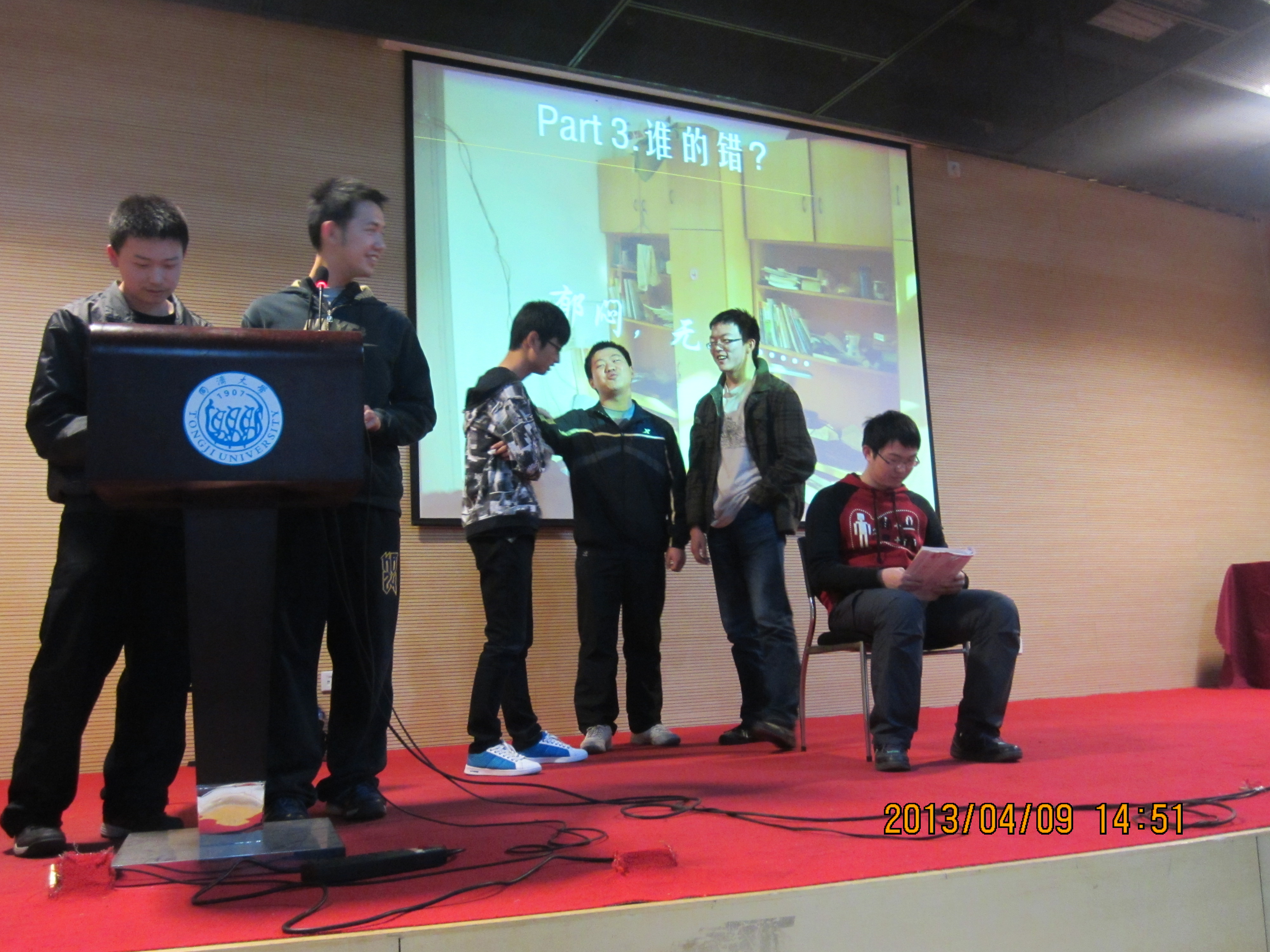 讲座过后,12级环科创新实验区的学生们上演了他们自编自排的心理剧《鱼与熊掌可以兼得》,剧情取材于校园生活,以心理剧这一活泼生动的形式让在座同学们在欢笑之余也对爱情与学业等问题进行思考。