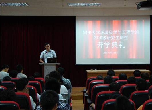 开学典礼首先由学院负责研究生工作的副院长李光明教授致辞,对2010级研究生新生表示欢迎并提出要求;环境工程系系主任杨殿海教授代表教师发言,特别指出作为研究生是创新知识;09级环境工程专业学生、现任学院研究生会主席沈军同学作为老生代表,就过去一年研究生学习、生活等方面的体会做了发言;2010级市政工程专业冯冬梅同学作为新生代表发言,并带领全体新生,在学院领导的见证下进行入学宣誓,表示要承诺誓言,不辜负老师和家长的期望,弘扬同济精神,恪守学术道德,为环境学院争光,为社会贡献力量。最后,环境学院院长周琪教授对学生们提出了殷切期望,希望同学们在研究生阶段学业、生活等各个方面都有很大提高和收获。