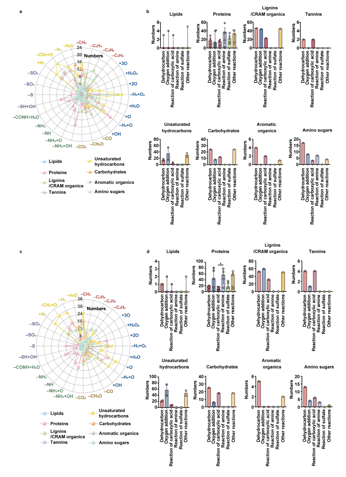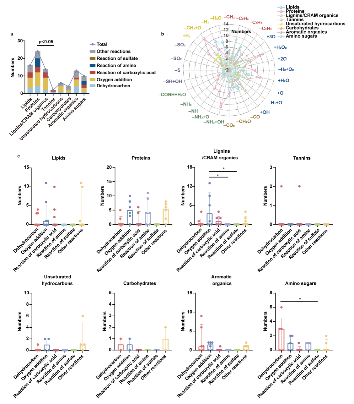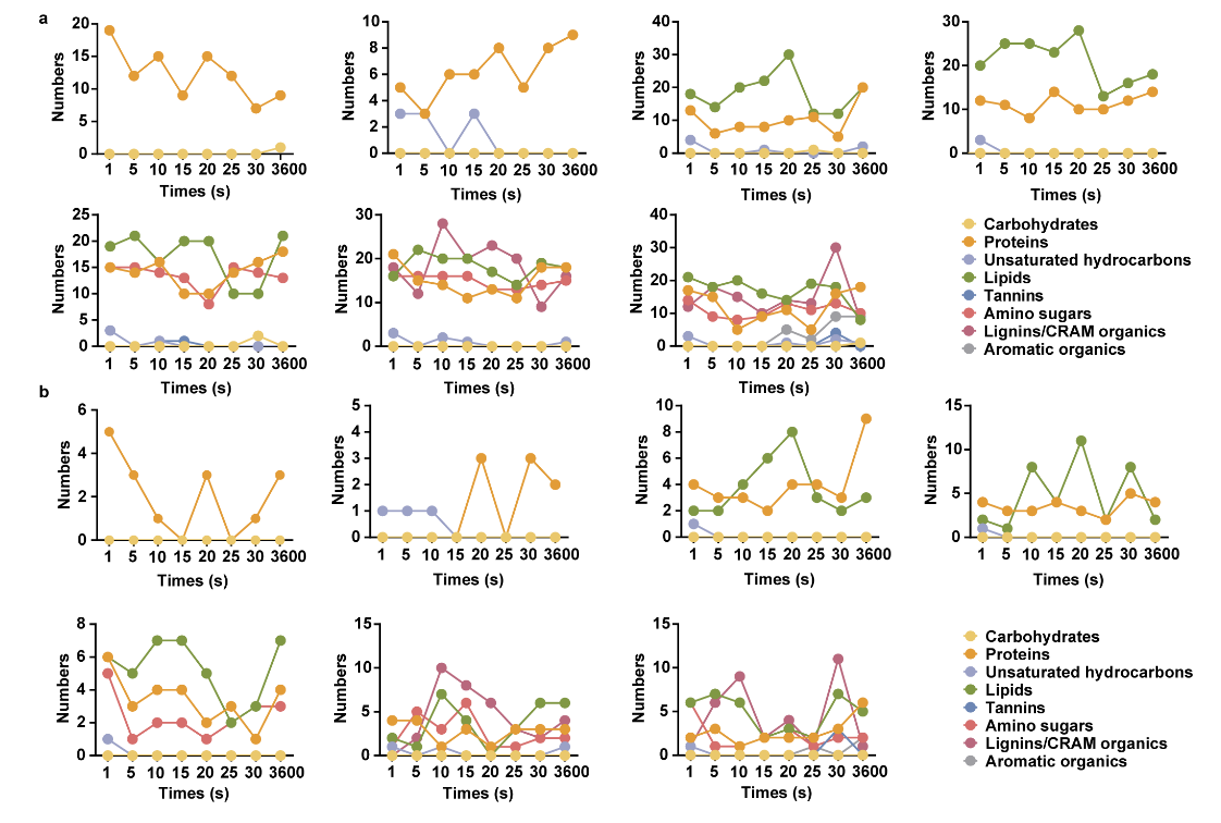 此外,研究团队通过挖掘单一单体反应与时间-梯度混合单体反应(含稳定同位素单体)衍生DOM的共有分子特征随时间梯度的变化规律,探究了Fenton降解不同DOM亚类的选择性。结果表明,Fenton的反应选择性大致如下:不饱和碳氢化合物>脂类=蛋白质>氨基糖>木质素/CRAM化合物>芳香类化合物>单宁>碳水化合物。同时,上述结论也由稳定同位素标记的衍生DOM分子信息得以验证。