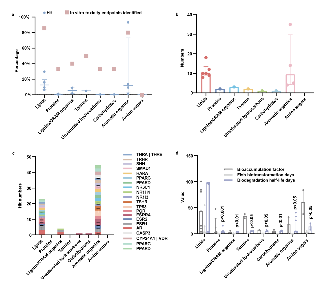 最后,研究团队针对已识别出转化途径的衍生DOM分子,进一步结合模型计算或数据库的体外和体内试验数据挖掘了Fenton衍生DOM分子的毒理特性。重点分析了体外试验活性检测命中数据,尤其是Tox21 10K。结果表明,与其他亚类相比,脂类和芳香化合物的衍生DOM分子具有更高的环境和人类健康风险。