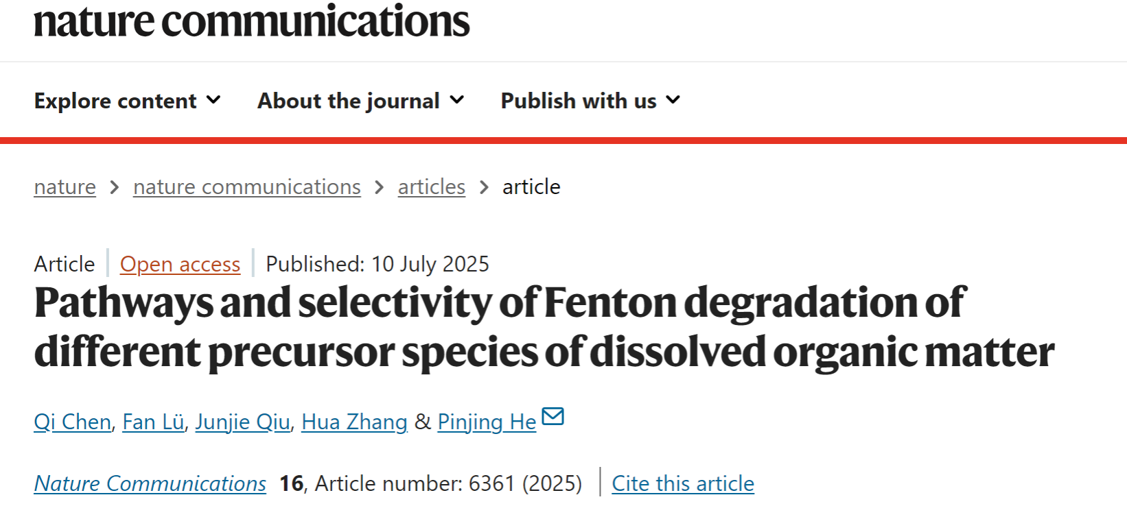 近日,我院何品晶教授团队在国际权威期刊Nature Communications发表题为“Pathways and selectivity of Fenton degradation of different precursor species of dissolved organic matter”的研究论文。该研究聚焦不同溶解性有机物(DOM)亚类的Fenton衍生DOM分子,基于超高分辨率质谱(UHRMS)的分子信息分析方法,结合不同层面的单体反应以及实际复杂介质的稳定同位素示踪反应,揭示且验证了Fenton降解不同DOM亚类的途径和选择性。该研究结论可为Fenton靶向降解有机废水中的DOM分子提供直接的理论依据。