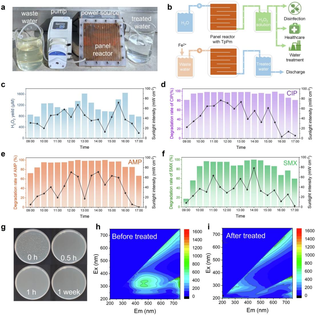 为验证光催化H2O2合成系统在原位水处理中的应用潜力,本论文构建了20×20 cm的平板反应器,在自然光照下高效连续生成H2O2,实现了新污染物的持续降解和长效水消毒。该光催化反应器对环丙沙星、磺胺甲恶唑和氨苄青霉素等抗生素的去除率均超过90%,并具有长效的消毒效果。集成的WOR过程解决了氧气限制问题,同时为ORR提供质子以高效合成H2O2,基于此,TpPm平板反应器即使在低光强下也能维持0.8~1.6 mM的H2O2持续生成。