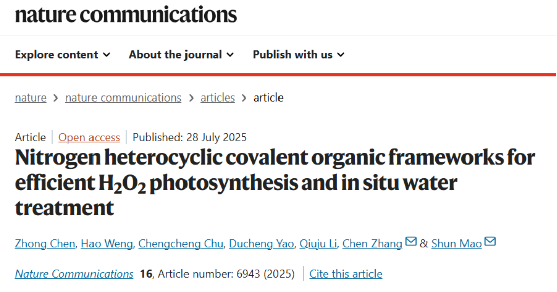 近日,我院毛舜教授团队在Nature子刊Nature Communications上发表了题为“Nitrogen heterocyclic covalent organic frameworks for efficient H2O2 photosynthesis and in situ water treatment”的论文。该论文合成了具有不同氮原子构型的氮杂环COFs光催化剂,通过调控其电子结构和能带结构,实现纯水中无需牺牲剂或氧气曝气条件下的高效H2O2生成,并在自然光照下实现了连续制备H2O2用于抗生素降解和长效水消毒。
